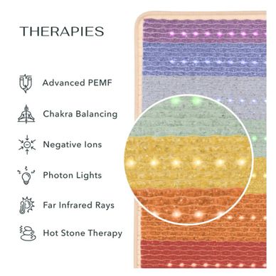 Clients can choose PEMF and light therapy during their sessions. The therapeutic rainbow chakra mat is filled with a variety of precious gems and infrared lights to help reduce inflammation, enhance circulation and provide a sense of grounding,